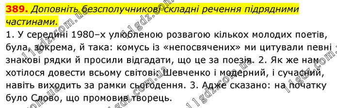Доповніть безсполучникові складні речення підрядними частинами. 1. У середині 1980–х улюбленою розвагою кількох молодих поетів, була, зокрема, й така: комусь із «непосвячених» ми цитували певні знакові рядки й просили відгадати, що це за поезія. 2. Як же нам хотілося довести всьому світові: Шевченко і модерний, і сучасний, навіть виходить за рамки сьогодення. 3. Адже сказано: на початку було Слово, що промовив творець.