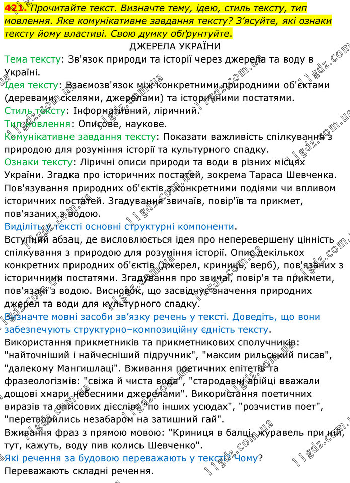 Прочитайте текст. Визначте тему, ідею, стиль тексту, тип мовлення. Яке комунікативне завдання тексту? З’ясуйте, які ознаки тексту йому властиві. Свою думку обґрунтуйте. ДЖЕРЕЛА УКРАЇНИ Тема тексту: Зв'язок природи та історії через джерела та воду в Україні. Ідея тексту: Взаємозв'язок між конкретними природними об'єктами (деревами, скелями, джерелами) та історичними постатями. Стиль тексту: Інформативний, ліричний. Тип мовлення: Описове, наукове. Комунікативне завдання тексту: Показати важливість спілкування з природою для розуміння історії та культурного спадку. Ознаки тексту: Ліричні описи природи та води в різних місцях України. Згадка про історичних постатей, зокрема Тараса Шевченка. Пов'язування природних об'єктів з конкретними подіями чи впливом історичних постатей. Згадування звичаїв, повір'їв та прикмет, пов'язаних з водою. Виділіть у тексті основні структурні компоненти. Вступний абзац, де висловлюється ідея про неперевершену цінність спілкування з природою для розуміння історії. Опис декількох конкретних природних об'єктів (джерел, криниць, верб), пов'язаних з історичними постатями. Згадування про звичаї, повір'я та прикмети, пов'язані з водою. Висновок, що засвідчує значення природних джерел та води для культурного спадку. Визначте мовні засоби зв’язку речень у тексті. Доведіть, що вони забезпечують структурно–композиційну єдність тексту. Використання прикметників та прикметникових сполучників: "найточніший і найчесніший підручник", "максим рильський писав", "далекому Мангишлаці". Вживання поетичних епітетів та фразеологізмів: "свіжа й чиста вода", "стародавні арійці вважали дощові хмари небесними джерелами". Використання поетичних виразів та описових дієслів: "по інших усюдах", "розчистив поет", "перетворились незабаром на затишний гай". Вживання фраз з прямою мовою: "Криниця в балці, журавель при ній, тут, кажуть, воду пив колись Шевченко". Які речення за будовою переважають у тексті? Чому? Переважають складні речення.