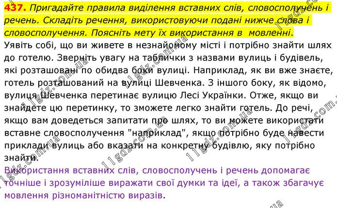 Пригадайте правила виділення вставних слів, словосполучень і речень. Складіть речення, використовуючи подані нижче слова і словосполучення. Поясніть мету їх використання в мовленні. Уявіть собі, що ви живете в незнайомому місті і потрібно знайти шлях до готелю. Зверніть увагу на таблички з назвами вулиць і будівель, які розташовані по обидва боки вулиці. Наприклад, як ви вже знаєте, готель розташований на вулиці Шевченка. З іншого боку, як відомо, вулиця Шевченка перетинає вулицю Лесі Українки. Отже, якщо ви знайдете цю перетинку, то зможете легко знайти готель. До речі, якщо вам доведеться запитати про шлях, то ви можете використати вставне словосполучення "наприклад", якщо потрібно буде навести приклади вулиць або вказати на конкретну будівлю, яку потрібно знайти. Використання вставних слів, словосполучень і речень допомагає точніше і зрозуміліше виражати свої думки та ідеї, а також збагачує мовлення різноманітністю виразів.