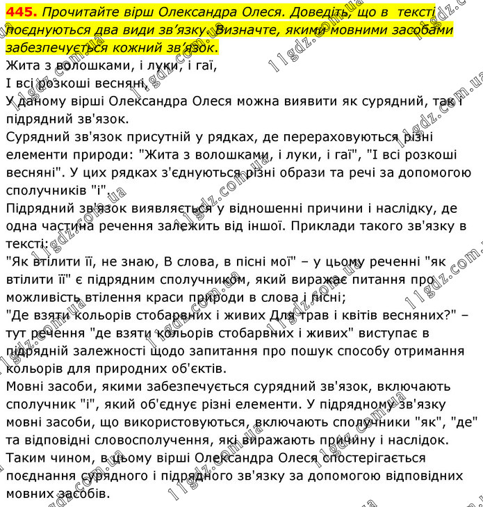 Прочитайте вірш Олександра Олеся. Доведіть, що в тексті поєднуються два види зв’язку. Визначте, якими мовними засобами забезпечується кожний зв’язок. Жита з волошками, і луки, і гаї, І всі розкоші весняні, У даному вірші Олександра Олеся можна виявити як сурядний, так і підрядний зв'язок. Сурядний зв'язок присутній у рядках, де перераховуються різні елементи природи: "Жита з волошками, і луки, і гаї", "І всі розкоші весняні". У цих рядках з'єднуються різні образи та речі за допомогою сполучників "і". Підрядний зв'язок виявляється у відношенні причини і наслідку, де одна частина речення залежить від іншої. Приклади такого зв'язку в тексті: "Як втілити її, не знаю, В слова, в пісні мої" – у цьому реченні "як втілити її" є підрядним сполучником, який виражає питання про можливість втілення краси природи в слова і пісні; "Де взяти кольорів стобарвних і живих Для трав і квітів весняних?" – тут речення "де взяти кольорів стобарвних і живих" виступає в підрядній залежності щодо запитання про пошук способу отримання кольорів для природних об'єктів. Мовні засоби, якими забезпечується сурядний зв'язок, включають сполучник "і", який об'єднує різні елементи. У підрядному зв'язку мовні засоби, що використовуються, включають сполучники "як", "де" та відповідні словосполучення, які виражають причину і наслідок. Таким чином, в цьому вірші Олександра Олеся спостерігається поєднання сурядного і підрядного зв'язку за допомогою відповідних мовних засобів.