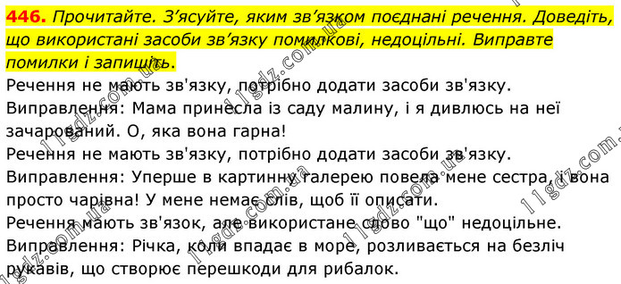 Прочитайте. З’ясуйте, яким зв’язком поєднані речення. Доведіть, що використані засоби зв’язку помилкові, недоцільні. Виправте помилки і запишіть. Речення не мають зв'язку, потрібно додати засоби зв'язку. Виправлення: Мама принесла із саду малину, і я дивлюсь на неї зачарований. О, яка вона гарна! Речення не мають зв'язку, потрібно додати засоби зв'язку. Виправлення: Уперше в картинну галерею повела мене сестра, і вона просто чарівна! У мене немає слів, щоб її описати. Речення мають зв'язок, але використане слово "що" недоцільне. Виправлення: Річка, коли впадає в море, розливається на безліч рукавів, що створює перешкоди для рибалок.