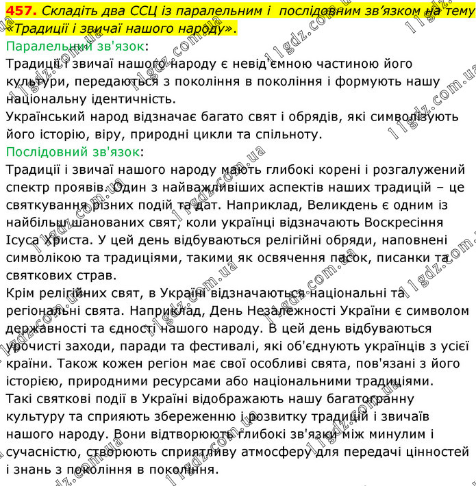 Складіть два ССЦ із паралельним і послідовним зв’язком на тему «Традиції і звичаї нашого народу». Паралельний зв'язок: Традиції і звичаї нашого народу є невід'ємною частиною його культури, передаються з покоління в покоління і формують нашу національну ідентичність. Український народ відзначає багато свят і обрядів, які символізують його історію, віру, природні цикли та спільноту. Послідовний зв'язок: Традиції і звичаї нашого народу мають глибокі корені і розгалужений спектр проявів. Один з найважливіших аспектів наших традицій – це святкування різних подій та дат. Наприклад, Великдень є одним із найбільш шанованих свят, коли українці відзначають Воскресіння Ісуса Христа. У цей день відбуваються релігійні обряди, наповнені символікою та традиціями, такими як освячення пасок, писанки та святкових страв. Крім релігійних свят, в Україні відзначаються національні та регіональні свята. Наприклад, День Незалежності України є символом державності та єдності нашого народу. В цей день відбуваються урочисті заходи, паради та фестивалі, які об'єднують українців з усієї країни. Також кожен регіон має свої особливі свята, пов'язані з його історією, природними ресурсами або національними традиціями. Такі святкові події в Україні відображають нашу багатогранну культуру та сприяють збереженню і розвитку традицій і звичаїв нашого народу. Вони відтворюють глибокі зв'язки між минулим і сучасністю, створюють сприятливу атмосферу для передачі цінностей і знань з покоління в покоління.