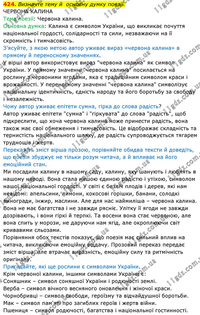 Визначте тему й основну думку поезії. ЧЕРВОНА КАЛИНА Тема поезії: Червона калина. Основна думка: Калина є символом України, що викликає почуття національної гордості, солідарності та сили, незважаючи на її скромність і тимчасовість. З’ясуйте, з якою метою автор уживає вираз «червона калина» в прямому й переносному значеннях. У вірші автор використовує вираз "червона калина" як символ України. У прямому значенні "червона калина" посилається на рослину з червоними ягодами, яка є традиційним символом краси і врожайності. У переносному значенні "червона калина" символізує національну ідентичність, єдність народу та його боротьбу за свободу і незалежність. Чому автор уживає епітети сумна, гірка до слова радість? Автор уживає епітети "сумна" і "гіркувата" до слова "радість", щоб підкреслити, що хоча червона калина може принести радість, вона також має свої обмеження і тимчасовість. Це відображає складність та тернистість національного шляху, де радість супроводжується тягарем труднощів і жертв. Перекажіть зміст вірша прозою, порівняйте обидва тексти й доведіть, що поезія збуджує не тільки розум читача, а й впливає на його емоційний стан. Ми посадили калину в нашому саду, калину, яку шанують і люблять в нашому народі. Вона стала нашою єдиною радістю і утіхою, символом нашої національної гордості. У світі є безліч плодів і дерев, які нам невідомі: апельсини, лимони, кокосові горішки, банани, солодкі виногради, інжир, маслини. Але для нас наймиліша – червона калина. Вона не має багатства і не завжди рясніє. Улітку її ягоди не завжди дозрівають, і вони гіркі й терпкі. Та восени вона стає червоною, але вона спить у морози, не даруючи нам ягід, але окроплюючи світ кривавими сльозами. Порівняння обох текстів показує, що поезія має сильний вплив на читача, викликаючи емоційну віддачу. Прозовий переказ передає зміст вірша, але втрачає виразність, емоційну силу та ритмічність оригіналу. Пригадайте, які ще рослини є символами України. Крім червоної калини, іншими символами України є: Соняшник – символ соняшної України і родючості землі. Верба – символ вічного весняного оновлення і жіночої краси. Чорнобривці – символ свободи, героїзму та відчайдушної боротьби. Мак – символ пам'яті про загиблих героїв і жертв війни. Пшениця – символ родючості, багатства і національної гостинності.