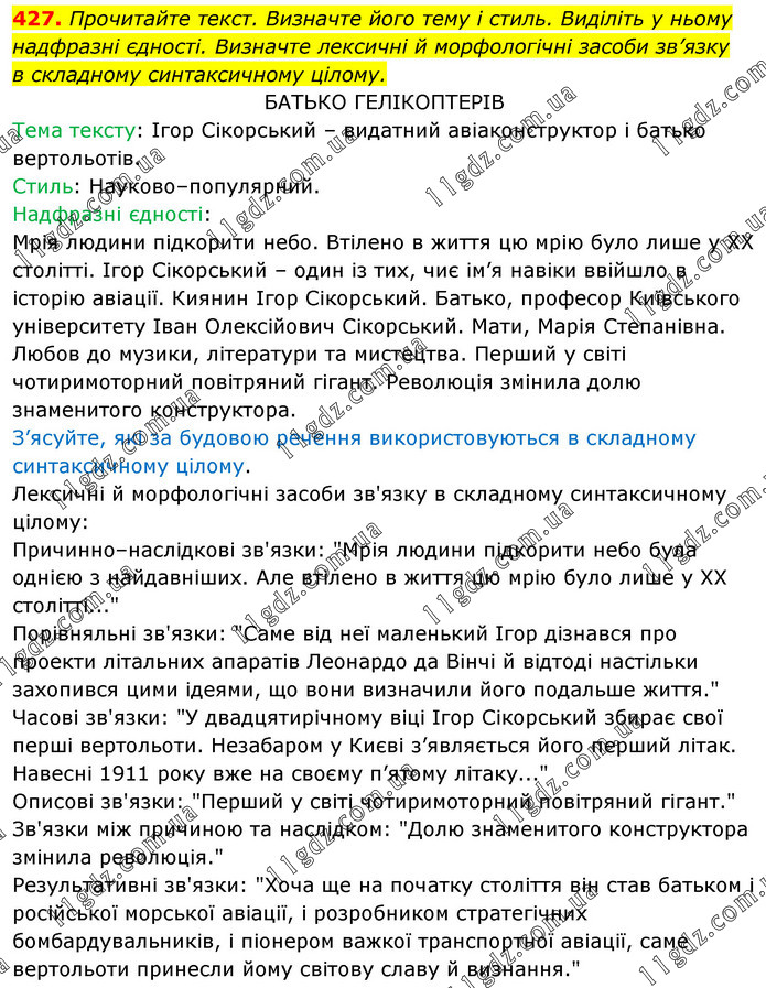 Прочитайте текст. Визначте його тему і стиль. Виділіть у ньому надфразні єдності. Визначте лексичні й морфологічні засоби зв’язку в складному синтаксичному цілому. БАТЬКО ГЕЛІКОПТЕРІВ Тема тексту: Ігор Сікорський – видатний авіаконструктор і батько вертольотів. Стиль: Науково–популярний. Надфразні єдності: Мрія людини підкорити небо. Втілено в життя цю мрію було лише у XX столітті. Ігор Сікорський – один із тих, чиє ім’я навіки ввійшло в історію авіації. Киянин Ігор Сікорський. Батько, професор Київського університету Іван Олексійович Сікорський. Мати, Марія Степанівна. Любов до музики, літератури та мистецтва. Перший у світі чотиримоторний повітряний гігант. Революція змінила долю знаменитого конструктора. З’ясуйте, які за будовою речення використовуються в складному синтаксичному цілому. Лексичні й морфологічні засоби зв'язку в складному синтаксичному цілому: Причинно–наслідкові зв'язки: "Мрія людини підкорити небо була однією з найдавніших. Але втілено в життя цю мрію було лише у XX столітті..." Порівняльні зв'язки: "Саме від неї маленький Ігор дізнався про проекти літальних апаратів Леонардо да Вінчі й відтоді настільки захопився цими ідеями, що вони визначили його подальше життя." Часові зв'язки: "У двадцятирічному віці Ігор Сікорський збирає свої перші вертольоти. Незабаром у Києві з’являється його перший літак. Навесні 1911 року вже на своєму п’ятому літаку..." Описові зв'язки: "Перший у світі чотиримоторний повітряний гігант." Зв'язки між причиною та наслідком: "Долю знаменитого конструктора змінила революція." Результативні зв'язки: "Хоча ще на початку століття він став батьком і російської морської авіації, і розробником стратегічних бомбардувальників, і піонером важкої транспортної авіації, саме вертольоти принесли йому світову славу й визнання."