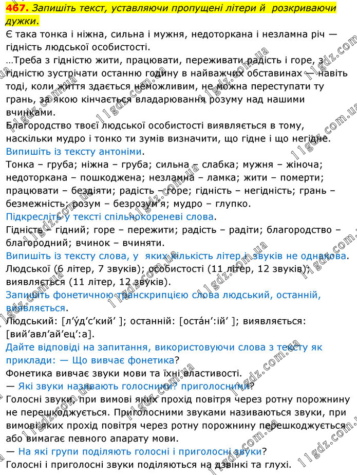Запишіть текст, уставляючи пропущені літери й розкриваючи дужки. Є така тонка і ніжна, сильна і мужня, недоторкана і незламна річ — гідність людської особистості. …Треба з гідністю жити, працювати, переживати радість і горе, з гідністю зустрічати останню годину в найважчих обставинах — навіть тоді, коли життя здається неможливим, не можна переступати ту грань, за якою кінчається владарювання розуму над нашими вчинками. Благородство твоєї людської особистості виявляється в тому, наскільки мудро і тонко ти зумів визначити, що гідне і що негідне. Випишіть із тексту антоніми. Тонка – груба; ніжна – груба; сильна – слабка; мужня – жіноча; недоторкана – пошкоджена; незламна – ламка; жити – померти; працювати – бездіяти; радість – горе; гідність – негідність; грань – безмежність; розум – безрозум'я; мудро – глупко. Підкресліть у тексті спільнокореневі слова. Гідність – гідний; горе – пережити; радість – радіти; благородство – благородний; вчинок – вчиняти. Випишіть із тексту слова, у яких кількість літер і звуків не однакова. Людської (6 літер, 7 звуків); особистості (11 літер, 12 звуків); виявляється (11 літер, 12 звуків). Запишіть фонетичною транскрипцією слова людський, останній, виявляється. Людський: [л’у́д’с’кий’ ]; останній: [оста́н’:ій’ ]; виявляється: [вий’авл’ай’ец’:а]. Дайте відповіді на запитання, використовуючи слова з тексту як приклади: — Що вивчає фонетика? Фонетика вивчає звуки мови та їхні властивості. — Які звуки називають голосними? приголосними? Голосні звуки, при вимові яких прохід повітря через ротну порожнину не перешкоджується. Приголосними звуками називаються звуки, при вимові яких прохід повітря через ротну порожнину перешкоджується або вимагає певного апарату мови. — На які групи поділяють голосні і приголосні звуки? Голосні і приголосні звуки поділяються на дзвінкі та глухі.