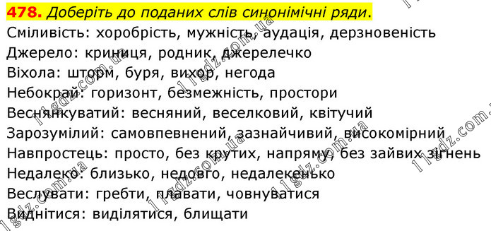 Доберіть до поданих слів синонімічні ряди. Сміливість: хоробрість, мужність, аудація, дерзновеність Джерело: криниця, родник, джерелечко Віхола: шторм, буря, вихор, негода Небокрай: горизонт, безмежність, простори Веснянкуватий: весняний, веселковий, квітучий Зарозумілий: самовпевнений, зазнайчивий, високомірний Навпростець: просто, без крутих, напряму, без зайвих зігнень Недалеко: близько, недовго, недалекенько Веслувати: гребти, плавати, човнуватися Виднітися: виділятися, блищати