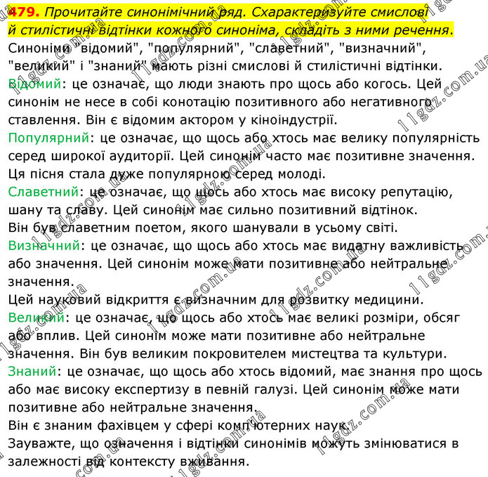 Прочитайте синонімічний ряд. Схарактеризуйте смислові й стилістичні відтінки кожного синоніма, складіть з ними речення. Синоніми "відомий", "популярний", "славетний", "визначний", "великий" і "знаний" мають різні смислові й стилістичні відтінки. Відомий: це означає, що люди знають про щось або когось. Цей синонім не несе в собі конотацію позитивного або негативного ставлення. Він є відомим актором у кіноіндустрії. Популярний: це означає, що щось або хтось має велику популярність серед широкої аудиторії. Цей синонім часто має позитивне значення. Ця пісня стала дуже популярною серед молоді. Славетний: це означає, що щось або хтось має високу репутацію, шану та славу. Цей синонім має сильно позитивний відтінок. Він був славетним поетом, якого шанували в усьому світі. Визначний: це означає, що щось або хтось має видатну важливість або значення. Цей синонім може мати позитивне або нейтральне значення. Цей науковий відкриття є визначним для розвитку медицини. Великий: це означає, що щось або хтось має великі розміри, обсяг або вплив. Цей синонім може мати позитивне або нейтральне значення. Він був великим покровителем мистецтва та культури. Знаний: це означає, що щось або хтось відомий, має знання про щось або має високу експертизу в певній галузі. Цей синонім може мати позитивне або нейтральне значення. Він є знаним фахівцем у сфері комп'ютерних наук. Зауважте, що означення і відтінки синонімів можуть змінюватися в залежності від контексту вживання.