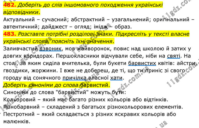 482. Доберіть до слів іншомовного походження українські відповідники. Актуальний – сучасний; абстрактний – узагальнений; оригінальний – автентичний; дайджест – огляд; імідж – образ. 483. Розставте потрібні розділові знаки. Підкресліть у тексті власне українські слова, поясніть їхні значення. Заливчастий дзвоник, мов жайворонок, повис над школою й затих у довгих коридорах. Першокласники відчували себе, ніби на святі. На столі, за яким сиділа вчителька, були букети барвистих квітів: айстри, гвоздики, жоржини. І вже не добереш, де ті, що ти приніс зі свого городу від сонячного причілка власної хати. Доберіть синоніми до слова барвистий. Синоніми до слова "барвистий" можуть бути: Кольоровий – який має багато різних кольорів або відтінків. Різнобарвний – складений з багатьох різнокольорових елементів. Пестротний – який складається з різних яскравих кольорів або малюнків.