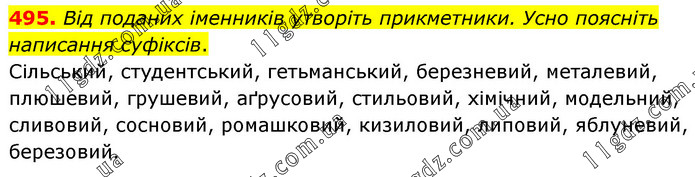 Від поданих іменників утворіть прикметники. Усно поясніть написання суфіксів. Сільський, студентський, гетьманський, березневий, металевий, плюшевий, грушевий, аґрусовий, стильовий, хімічний, модельний, сливовий, сосновий, ромашковий, кизиловий, липовий, яблуневий, березовий.