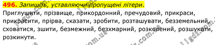 Запишіть, уставляючи пропущені літери. Приглушити, прізвище, прикордонний, пречудовий, прикраси, прикрасити, прірва, сказати, зробити, розташувати, безземельний, сховатися, зшити, безмежний, безхмарний, розколений, розшукати, розкинути.