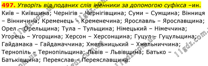 Утворіть від поданих слів іменники за допомогою суфікса –ин. Київ – Київщина; Чернігів – Чернігівщина; Суми – Сумщина; Вінниця – Вінничина; Кременець – Кременечина; Ярославль – Ярославщина; Орел – Орельщина; Тула – Тульщина; Німецький – Німеччина; Угорець – Угорщина; Херсон – Херсонщина; Гуцул – Гуцульщина; Гайдамака – Гайдамаччина; Хмельницький – Хмельниччина; Тернопіль – Тернопільщина; Львів – Львівщина; Батько – Батьківщина; Переяслав – Переяславщина.