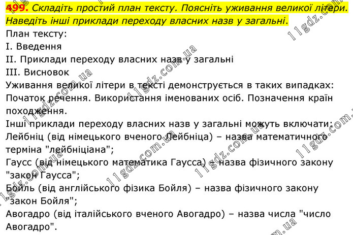 Складіть простий план тексту. Поясніть уживання великої літери. Наведіть інші приклади переходу власних назв у загальні. План тексту: I. Введення II. Приклади переходу власних назв у загальні III. Висновок Уживання великої літери в тексті демонструється в таких випадках: Початок речення. Використання іменованих осіб. Позначення країн походження. Інші приклади переходу власних назв у загальні можуть включати: Лейбніц (від німецького вченого Лейбніца) – назва математичного терміна "лейбніціана"; Гаусс (від німецького математика Гаусса) – назва фізичного закону "закон Гаусса"; Бойль (від англійського фізика Бойля) – назва фізичного закону "закон Бойля"; Авогадро (від італійського вченого Авогадро) – назва числа "число Авогадро".