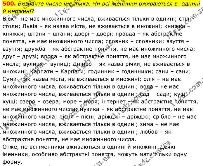 Визначте число іменника. Чи всі іменники вживаються в однині й множині? Віск – не має множинного числа, вживається тільки в однині; стіл – столи; Львів – як назва міста, не вживається в множині; книжка – книжки; штани – штани; двері – двері; правда – як абстрактне поняття, не має множинного числа; словник – словники; взуття – взуття; дружба – як абстрактне поняття, не має множинного числа; друг – друзі; врода – як абстрактне поняття, не має множинного числа; вулиця – вулиці; Дніпро – як назва річки, не вживається в множині; Карпати – Карпати; годинник – годинники; сани – сани; Суми – як назва міста, не вживається в множині; олія – не має множинного числа, вживається тільки в однині; вода – не має множинного числа, вживається тільки в однині; сад – сади; кущ – кущі; озеро – озера; море – моря; інтернет – як абстрактне поняття, не має множинного числа; музика – як абстрактне поняття, не має множинного числа; пісня – пісні; дріжджі – дріжджі; срібло – не має множинного числа, вживається тільки в однині; зима – не має множинного числа, вживається тільки в однині; любов – як абстрактне поняття, не має множинного числа. Отже, не всі іменники вживаються в однині й множині. Деякі іменники, особливо абстрактні поняття, можуть мати тільки одну форму.