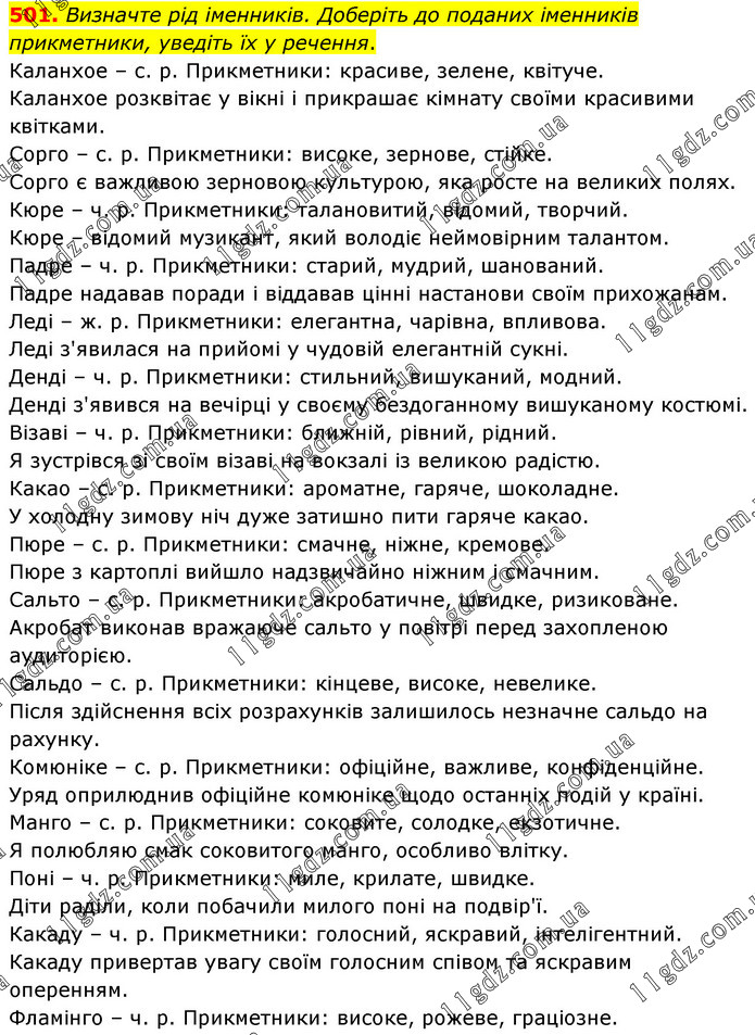 Визначте рід іменників. Доберіть до поданих іменників прикметники, уведіть їх у речення. Каланхое – с. р. Прикметники: красиве, зелене, квітуче. Каланхое розквітає у вікні і прикрашає кімнату своїми красивими квітками. Сорго – с. р. Прикметники: високе, зернове, стійке. Сорго є важливою зерновою культурою, яка росте на великих полях. Кюре – ч. р. Прикметники: талановитий, відомий, творчий. Кюре – відомий музикант, який володіє неймовірним талантом. Падре – ч. р. Прикметники: старий, мудрий, шанований. Падре надавав поради і віддавав цінні настанови своїм прихожанам. Леді – ж. р. Прикметники: елегантна, чарівна, впливова. Леді з'явилася на прийомі у чудовій елегантній сукні. Денді – ч. р. Прикметники: стильний, вишуканий, модний. Денді з'явився на вечірці у своєму бездоганному вишуканому костюмі. Візаві – ч. р. Прикметники: ближній, рівний, рідний. Я зустрівся зі своїм візаві на вокзалі із великою радістю. Какао – с. р. Прикметники: ароматне, гаряче, шоколадне. У холодну зимову ніч дуже затишно пити гаряче какао. Пюре – с. р. Прикметники: смачне, ніжне, кремове. Пюре з картоплі вийшло надзвичайно ніжним і смачним. Сальто – с. р. Прикметники: акробатичне, швидке, ризиковане. Акробат виконав вражаюче сальто у повітрі перед захопленою аудиторією. Сальдо – с. р. Прикметники: кінцеве, високе, невелике. Після здійснення всіх розрахунків залишилось незначне сальдо на рахунку. Комюніке – с. р. Прикметники: офіційне, важливе, конфіденційне. Уряд оприлюднив офіційне комюніке щодо останніх подій у країні. Манго – с. р. Прикметники: соковите, солодке, екзотичне. Я полюбляю смак соковитого манго, особливо влітку. Поні – ч. р. Прикметники: миле, крилате, швидке. Діти раділи, коли побачили милого поні на подвір'ї. Какаду – ч. р. Прикметники: голосний, яскравий, інтелігентний. Какаду привертав увагу своїм голосним співом та яскравим оперенням. Фламінго – ч. р. Прикметники: високе, рожеве, граціозне.