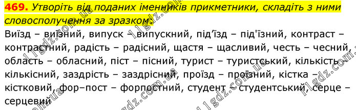 Утворіть від поданих іменників прикметники, складіть з ними словосполучення за зразком: Виїзд – виїзний, випуск – випускний, під’їзд – під'їзний, контраст – контрастний, радість – радісний, щастя – щасливий, честь – чесний, область – обласний, піст – пісний, турист – туристський, кількість – кількісний, заздрість – заздрісний, проїзд – проїзний, кістка – кістковий, фор–пост – форпостний, студент – студентський, серце – серцевий