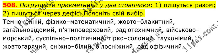 Погрупуйте прикметники у два стовпчики: 1) пишуться разом; 2) пишуться через дефіс. Поясніть свій вибір. Темно–синій, фізико–математичний, жовто–блакитний, загальновідомий, п’ятиповерховий, радіотехнічний, військово–морський, суспільно–політичний, гірко–солоний, глухонімий, жовтогарячий, сніжно–білий, білосніжний, радіофізичний.