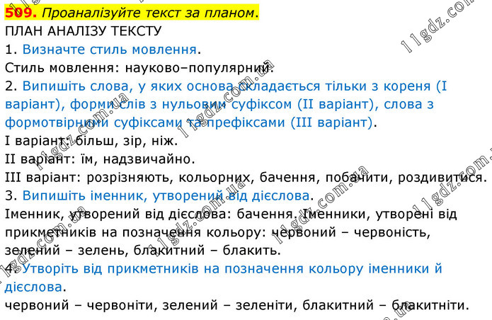 Проаналізуйте текст за планом. ПЛАН АНАЛІЗУ ТЕКСТУ 1. Визначте стиль мовлення. Стиль мовлення: науково–популярний. 2. Випишіть слова, у яких основа складається тільки з кореня (I варіант), форми слів з нульовим суфіксом (II варіант), слова з формотвірними суфіксами та префіксами (III варіант). I варіант: більш, зір, ніж. II варіант: їм, надзвичайно. III варіант: розрізняють, кольорних, бачення, побачити, роздивитися. 3. Випишіть іменник, утворений від дієслова. Іменник, утворений від дієслова: бачення. Іменники, утворені від прикметників на позначення кольору: червоний – червоність, зелений – зелень, блакитний – блакить. 4. Утворіть від прикметників на позначення кольору іменники й дієслова. червоний – червоніти, зелений – зеленіти, блакитний – блакитніти.