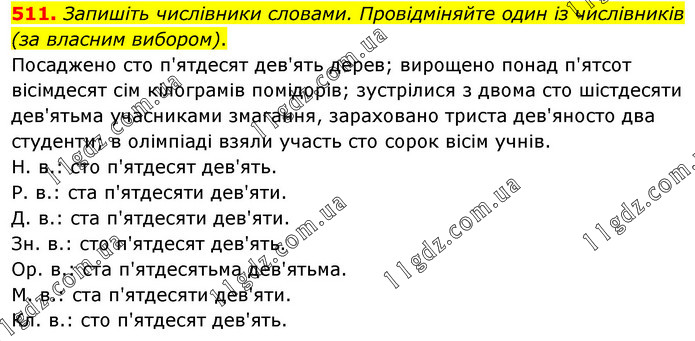 Запишіть числівники словами. Провідміняйте один із числівників (за власним вибором). Посаджено сто п'ятдесят дев'ять дерев; вирощено понад п'ятсот вісімдесят сім кілограмів помідорів; зустрілися з двома сто шістдесяти дев'ятьма учасниками змагання, зараховано триста дев'яносто два студенти; в олімпіаді взяли участь сто сорок вісім учнів. Н. в.: сто п'ятдесят дев'ять. Р. в.: ста п'ятдесяти дев'яти. Д. в.: ста п'ятдесяти дев'яти. Зн. в.: сто п'ятдесят дев'ять. Ор. в.: ста п'ятдесятьма дев'ятьма. М. в.: ста п'ятдесяти дев'яти. Кл. в.: сто п'ятдесят дев'ять.