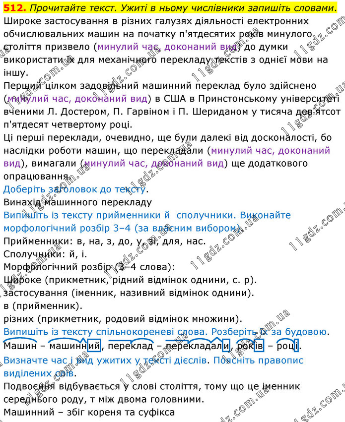 Прочитайте текст. Ужиті в ньому числівники запишіть словами. Широке застосування в різних галузях діяльності електронних обчислювальних машин на початку п'ятдесятих років минулого століття призвело (минулий час, доконаний вид) до думки використати їх для механічного перекладу текстів з однієї мови на іншу. Перший цілком задовільний машинний переклад було здійснено (минулий час, доконаний вид) в США в Принстонському університеті вченими Л. Достером, П. Гарвіном і П. Шериданом у тисяча дев'ятсот п'ятдесят четвертому році. Ці перші переклади, очевидно, ще були далекі від досконалості, бо наслідки роботи машин, що перекладали (минулий час, доконаний вид), вимагали (минулий час, доконаний вид) ще додаткового опрацювання. Доберіть заголовок до тексту. Винахід машинного перекладу Випишіть із тексту прийменники й сполучники. Виконайте морфологічний розбір 3–4 (за власним вибором). Прийменники: в, на, з, до, у, зі, для, нас. Сполучники: й, і. Морфологічний розбір (3–4 слова): Широке (прикметник, рідний відмінок однини, с. р). застосування (іменник, називний відмінок однини). в (прийменник). різних (прикметник, родовий відмінок множини). Випишіть із тексту спільнокореневі слова. Розберіть їх за будовою. Машин – машинний, переклад – перекладали, років – році. Визначте час і вид ужитих у тексті дієслів. Поясніть правопис виділених слів. Подвоєння відбувається у слові століття, тому що це іменник середнього роду, т між двома головними. Машинний – збіг кореня та суфікса