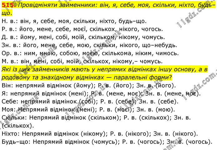 Провідміняти займенники: він, я, себе, моя, скільки, ніхто, будь–що. Н. в.: він, я, себе, моя, скільки, ніхто, будь–що. Р. в.: його, мене, себе, моєї, скількох, нікого, чогось. Д. в.: йому, мені, собі, моїй, скільком, нікому, чомусь. Зн. в.: його, мене, себе, мою, скільки, нікого, що–небудь. Ор. в.: ним, мною, собою, моєю, скількома, ніким, чимось. М. в.: він, мені, собі, моїй, скількох, нікому,– чомусь. Які із цих займенників мають у непрямих відмінках іншу основу, а в родовому та знахідному відмінках — паралельні форми? Він: непрямий відмінок (йому); Р. в. (його); Зн. в. (його). Я: непрямий відмінок (мені); Р. в. (мене, моє); Зн. в. (мене, моє). Себе: непрямий відмінок (собі); Р. в. (себе); Зн. в. (себе). Моя: Непрямий відмінок (мені); Р. в. (моєї); Зн. в. (мою). Скільки: Непрямий відмінок (скільком); Р. в. (скількох); Зн. в. (скількох). Ніхто: Непрямий відмінок (нікому); Р. в. (нікого); Зн. в. (нікого). Будь–що: Непрямий відмінок (чомусь); Р. в. (чогось); Зн. в. (чогось).