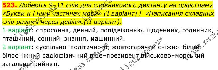 Доберіть 9–11 слів для словникового диктанту на орфограму «Букви н і нн у частинах мови» (I варіант) і «Написання складних слів разом і через дефіс» (II варіант). 1 варіант: спросоння, денний, попідвіконню, щоденник, годинник, пташиний, сонний, знання, машинний. 2 варіант: суспільно–політичного, жовтогарячий сніжно–білий білосніжний радіофізичний віце–президент військово–морський загальноприйняті.