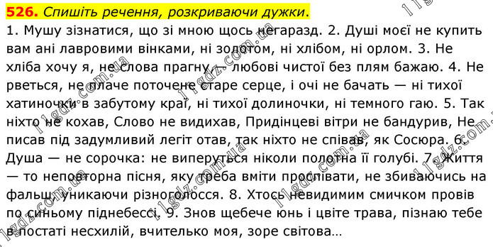 Спишіть речення, розкриваючи дужки. 1. Мушу зізнатися, що зі мною щось негаразд. 2. Душі моєї не купить вам ані лавровими вінками, ні золотом, ні хлібом, ні орлом. 3. Не хліба хочу я, не слова прагну,— любові чистої без плям бажаю. 4. Не рветься, не плаче поточене старе серце, і очі не бачать — ні тихої хатиночки в забутому краї, ні тихої долиночки, ні темного гаю. 5. Так ніхто не кохав, Слово не видихав, Придінцеві вітри не бандурив, Не писав під задумливий легіт отав, так ніхто не співав, як Сосюра. 6. Душа — не сорочка: не виперуться ніколи полотна її голубі. 7. Життя — то неповторна пісня, яку треба вміти проспівати, не збиваючись на фальш, уникаючи різноголосся. 8. Хтось невидимим смичком провів по синьому піднебессі. 9. Знов щебече юнь і цвіте трава, пізнаю тебе в постаті несхилій, вчителько моя, зоре світова…