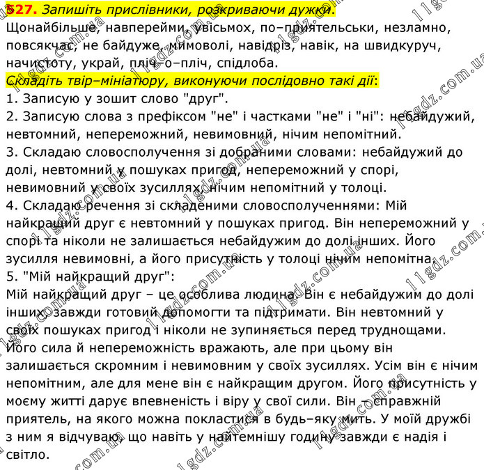 Запишіть прислівники, розкриваючи дужки. Щонайбільше, навперейми, увісьмох, по–приятельськи, незламно, повсякчас, не байдуже, мимоволі, навідріз, навік, на швидкуруч, начистоту, украй, пліч–о–пліч, спідлоба. Складіть твір–мініатюру, виконуючи послідовно такі дії: 1. Записую у зошит слово "друг". 2. Записую слова з префіксом "не" і частками "не" і "ні": небайдужий, невтомний, непереможний, невимовний, нічим непомітний. 3. Складаю словосполучення зі добраними словами: небайдужий до долі, невтомний у пошуках пригод, непереможний у спорі, невимовний у своїх зусиллях, нічим непомітний у толоці. 4. Складаю речення зі складеними словосполученнями: Мій найкращий друг є невтомний у пошуках пригод. Він непереможний у спорі та ніколи не залишається небайдужим до долі інших. Його зусилля невимовні, а його присутність у толоці нічим непомітна. 5. "Мій найкращий друг": Мій найкращий друг – це особлива людина. Він є небайдужим до долі інших, завжди готовий допомогти та підтримати. Він невтомний у своїх пошуках пригод і ніколи не зупиняється перед труднощами. Його сила й непереможність вражають, але при цьому він залишається скромним і невимовним у своїх зусиллях. Усім він є нічим непомітним, але для мене він є найкращим другом. Його присутність у моєму житті дарує впевненість і віру у свої сили. Він – справжній приятель, на якого можна покластися в будь–яку мить. У моїй дружбі з ним я відчуваю, що навіть у найтемнішу годину завжди є надія і світло.