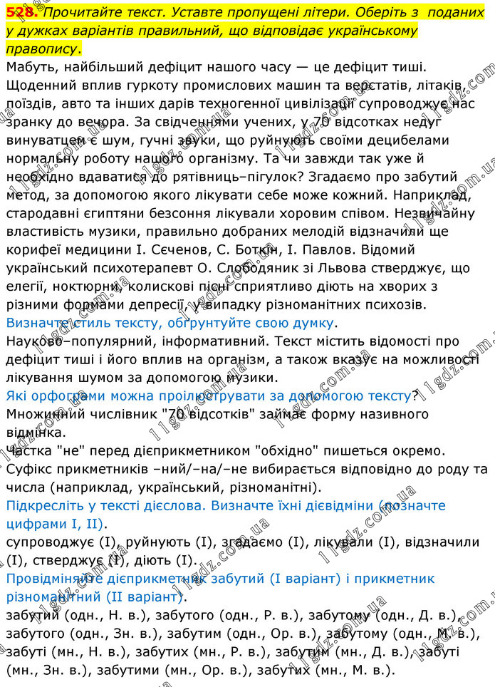 Прочитайте текст. Уставте пропущені літери. Оберіть з поданих у дужках варіантів правильний, що відповідає українському правопису. Мабуть, найбільший дефіцит нашого часу — це дефіцит тиші. Щоденний вплив гуркоту промислових машин та верстатів, літаків, поїздів, авто та інших дарів техногенної цивілізації супроводжує нас зранку до вечора. За свідченнями учених, у 70 відсотках недуг винуватцем є шум, гучні звуки, що руйнують своїми децибелами нормальну роботу нашого організму. Та чи завжди так уже й необхідно вдаватися до рятівниць–пігулок? Згадаємо про забутий метод, за допомогою якого лікувати себе може кожний. Наприклад, стародавні єгиптяни безсоння лікували хоровим співом. Незвичайну властивість музики, правильно добраних мелодій відзначили ще корифеї медицини І. Сєченов, С. Боткін, І. Павлов. Відомий український психотерапевт О. Слободяник зі Львова стверджує, що елегії, ноктюрни, колискові пісні сприятливо діють на хворих з різними формами депресії, у випадку різноманітних психозів. Визначте стиль тексту, обґрунтуйте свою думку. Науково–популярний, інформативний. Текст містить відомості про дефіцит тиші і його вплив на організм, а також вказує на можливості лікування шумом за допомогою музики. Які орфограми можна проілюструвати за допомогою тексту? Множинний числівник "70 відсотків" займає форму називного відмінка. Частка "не" перед дієприкметником "обхідно" пишеться окремо. Суфікс прикметників –ний/–на/–не вибирається відповідно до роду та числа (наприклад, український, різноманітні). Підкресліть у тексті дієслова. Визначте їхні дієвідміни (позначте цифрами I, II). супроводжує (I), руйнують (I), згадаємо (I), лікували (I), відзначили (I), стверджує (I), діють (I). Провідміняйте дієприкметник забутий (I варіант) і прикметник різноманітний (II варіант). забутий (одн., Н. в.), забутого (одн., Р. в.), забутому (одн., Д. в.), забутого (одн., Зн. в.), забутим (одн., Ор. в.), забутому (одн., М. в.), забуті (мн., Н. в.), забутих (мн., Р. в.), забутим (мн., Д. в.), забуті (мн., Зн. в.), забутими (мн., Ор. в.), забутих (мн., М. в.).