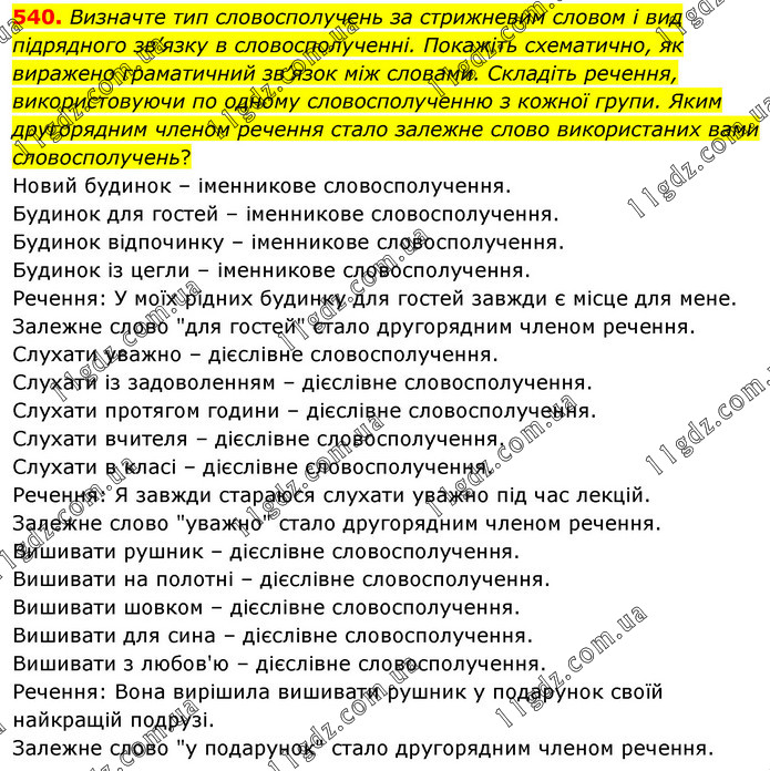 Визначте тип словосполучень за стрижневим словом і вид підрядного зв’язку в словосполученні. Покажіть схематично, як виражено граматичний зв’язок між словами. Складіть речення, використовуючи по одному словосполученню з кожної групи. Яким другорядним членом речення стало залежне слово використаних вами словосполучень? Новий будинок – іменникове словосполучення. Будинок для гостей – іменникове словосполучення. Будинок відпочинку – іменникове словосполучення. Будинок із цегли – іменникове словосполучення. Речення: У моїх рідних будинку для гостей завжди є місце для мене. Залежне слово "для гостей" стало другорядним членом речення. Слухати уважно – дієслівне словосполучення. Слухати із задоволенням – дієслівне словосполучення. Слухати протягом години – дієслівне словосполучення. Слухати вчителя – дієслівне словосполучення. Слухати в класі – дієслівне словосполучення. Речення: Я завжди стараюся слухати уважно під час лекцій. Залежне слово "уважно" стало другорядним членом речення. Вишивати рушник – дієслівне словосполучення. Вишивати на полотні – дієслівне словосполучення. Вишивати шовком – дієслівне словосполучення. Вишивати для сина – дієслівне словосполучення. Вишивати з любов'ю – дієслівне словосполучення. Речення: Вона вирішила вишивати рушник у подарунок своїй найкращій подрузі. Залежне слово "у подарунок" стало другорядним членом речення.