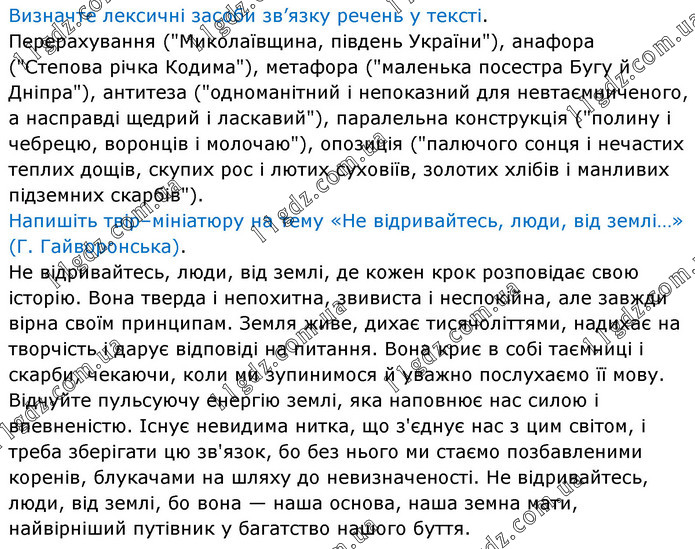 Визначте лексичні засоби зв’язку речень у тексті. Перерахування ("Миколаївщина, південь України"), анафора ("Степова річка Кодима"), метафора ("маленька посестра Бугу й Дніпра"), антитеза ("одноманітний і непоказний для невтаємниченого, а насправді щедрий і ласкавий"), паралельна конструкція ("полину і чебрецю, воронців і молочаю"), опозиція ("палючого сонця і нечастих теплих дощів, скупих рос і лютих суховіїв, золотих хлібів і манливих підземних скарбів"). Напишіть твір–мініатюру на тему «Не відривайтесь, люди, від землі…» (Г. Гайворонська). Не відривайтесь, люди, від землі, де кожен крок розповідає свою історію. Вона тверда і непохитна, звивиста і неспокійна, але завжди вірна своїм принципам. Земля живе, дихає тисячоліттями, надихає на творчість і дарує відповіді на питання. Вона криє в собі таємниці і скарби, чекаючи, коли ми зупинимося й уважно послухаємо її мову. Відчуйте пульсуючу енергію землі, яка наповнює нас силою і впевненістю. Існує невидима нитка, що з'єднує нас з цим світом, і треба зберігати цю зв'язок, бо без нього ми стаємо позбавленими коренів, блукачами на шляху до невизначеності. Не відривайтесь, люди, від землі, бо вона — наша основа, наша земна мати, найвірніший путівник у багатство нашого буття.