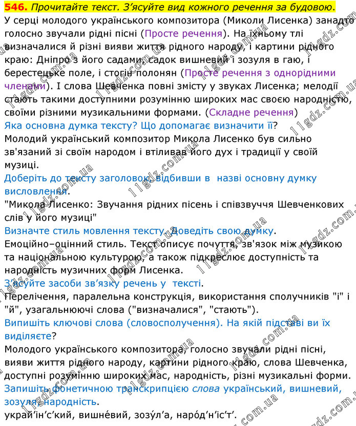 Прочитайте текст. З’ясуйте вид кожного речення за будовою. У серці молодого українського композитора (Миколи Лисенка) занадто голосно звучали рідні пісні (Просте речення). На їхньому тлі визначалися й різні вияви життя рідного народу, і картини рідного краю: Дніпро з його садами, садок вишневий і зозуля в гаю, і берестецьке поле, і стогін полонян (Просте речення з однорідними членами). І слова Шевченка повні змісту у звуках Лисенка; мелодії стають такими доступними розумінню широких мас своєю народністю, своїми різними музикальними формами. (Складне речення) Яка основна думка тексту? Що допомагає визначити її? Молодий український композитор Микола Лисенко був сильно зв'язаний зі своїм народом і втіливав його дух і традиції у своїй музиці. Доберіть до тексту заголовок, відбивши в назві основну думку висловлення. "Микола Лисенко: Звучання рідних пісень і співзвуччя Шевченкових слів у його музиці" Визначте стиль мовлення тексту. Доведіть свою думку. Емоційно–оцінний стиль. Текст описує почуття, зв'язок між музикою та національною культурою, а також підкреслює доступність та народність музичних форм Лисенка. З’ясуйте засоби зв’язку речень у тексті. Перелічення, паралельна конструкція, використання сполучників "і" і "й", узагальнюючі слова ("визначалися", "стають"). Випишіть ключові слова (словосполучення). На якій підставі ви їх виділяєте? Молодого українського композитора, голосно звучали рідні пісні, вияви життя рідного народу, картини рідного краю, слова Шевченка, доступні розумінню широких мас, народність, різні музикальні форми. Запишіть фонетичною транскрипцією слова український, вишневий, зозуля, народність. украй’ін’с’кий, вишне́вий, зозу́л’а, наро́д’н’іс’т’.