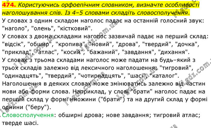 Користуючись орфоепічним словником, визначте особливості наголошування слів. Із 4–5 словами складіть словосполучення. У словах з одним складом наголос падає на останній голосний звук: "наголо", "олень", "кістковий". У словах з двома складами наголос зазвичай падає на перший склад: "відсік", "обшир", "кропива", "новий", "дрова", "твердий", "дочка", "приклад", "атлас", "косий", "бажаний", "завдання", "дихання". У словах з трьома складами наголос може падати на будь–який з трьох складів залежно від лексичного наголошення: "тигровий", "одинадцять", "твердий", "чотирнадцять", "шасі", "каталог". Наголошення в деяких словах може змінюватись залежно від частин мови або форми слова. Наприклад, у слові "брати" наголос падає на перший склад у формі множини ("брати") та на другий склад у формі однини ("беру"). Словосполучення: обширні дрова; нове завдання; тигровий атлас; тверде шасі.