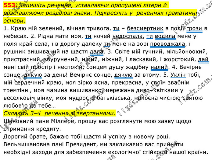 Запишіть речення, уставляючи пропущені літери й розставляючи розділові знаки. Підкресліть у реченнях граматичні основи. 1. Краю мій зелений, вічная тривога, ти – безсмертник в полі, грози в небесах. 2. Рідна мати моя, ти ночей недоспала, ти водила мене у поля край села, і в дорогу далеку ти мене на зорі проводжала, і рушник вишиваний на щастя дала. 3. Світе мій гучний, мільйоноокий, пристрасний, збурунений, німий, ніжний, і ласкавий, і жорстокий, дай мені свій простір і неспокій, сонцем душу жадібну налий. 4. Вечірнє сонце, дякую за день! Вечірнє сонце, дякую за втому. 5. Уклін тобі, мій сердечний краю, моя зірко ясна, прекрасна, у своїм звабнім тремтінні, моя мамина вишиванко, мережана диво–квітками у веселковім вінку, моя мудросте батьківська, напоєна чистою святою любов’ю до тебе… Складіть 3–4 речення зі звертаннями. Шановний пане Міллере, прошу вас розглянути мою заяву щодо отримання кредиту. Дорогий брате, бажаю тобі щастя й успіху в новому році. Вельмишановна пані Президент, ми закликаємо вас прийняти необхідні заходи для забезпечення екологічної стійкості нашої країни.