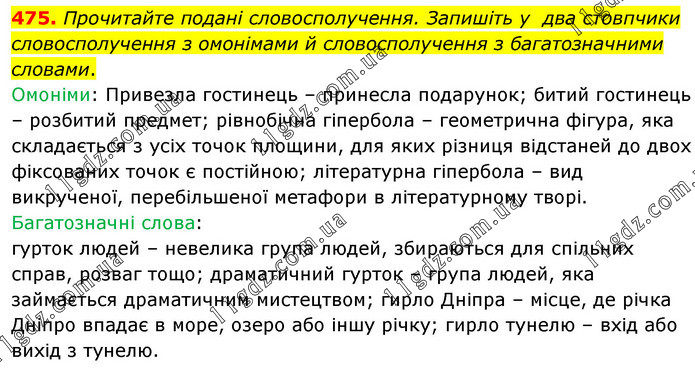 Прочитайте подані словосполучення. Запишіть у два стовпчики словосполучення з омонімами й словосполучення з багатозначними словами. Омоніми: Привезла гостинець – принесла подарунок; битий гостинець – розбитий предмет; рівнобічна гіпербола – геометрична фігура, яка складається з усіх точок площини, для яких різниця відстаней до двох фіксованих точок є постійною; літературна гіпербола – вид викрученої, перебільшеної метафори в літературному творі. Багатозначні слова: гурток людей – невелика група людей, збираються для спільних справ, розваг тощо; драматичний гурток – група людей, яка займається драматичним мистецтвом; гирло Дніпра – місце, де річка Дніпро впадає в море, озеро або іншу річку; гирло тунелю – вхід або вихід з тунелю.