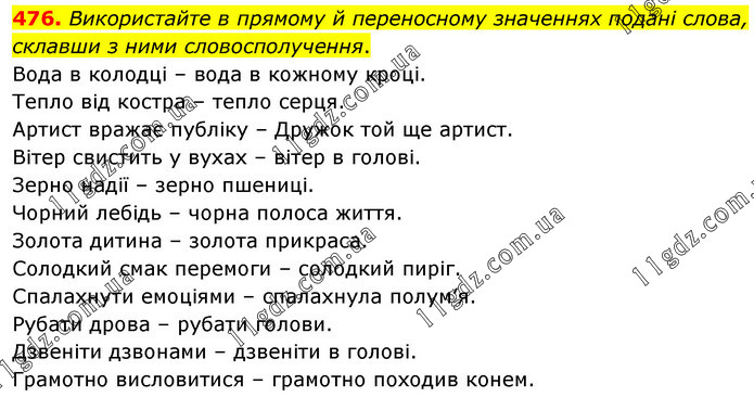 Використайте в прямому й переносному значеннях подані слова, склавши з ними словосполучення. Вода в колодці – вода в кожному кроці. Тепло від костра – тепло серця. Артист вражає публіку – Дружок той ще артист. Вітер свистить у вухах – вітер в голові. Зерно надії – зерно пшениці. Чорний лебідь – чорна полоса життя. Золота дитина – золота прикраса. Солодкий смак перемоги – солодкий пиріг. Спалахнути емоціями – спалахнула полум’я. Рубати дрова – рубати голови. Дзвеніти дзвонами – дзвеніти в голові. Грамотно висловитися – грамотно походив конем.