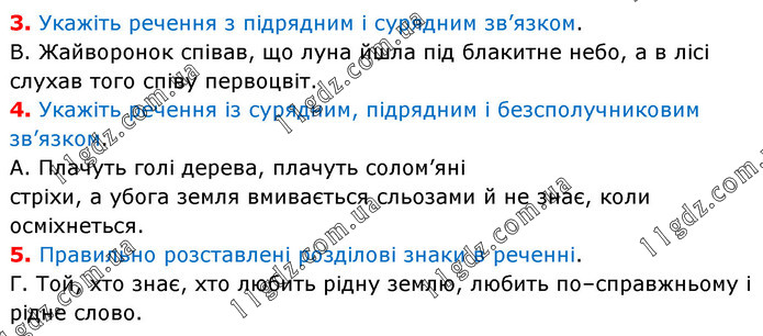 3. Укажіть речення з підрядним і сурядним зв’язком. В. Жайворонок співав, що луна йшла під блакитне небо, а в лісі слухав того співу первоцвіт. 4. Укажіть речення із сурядним, підрядним і безсполучниковим зв’язком. А. Плачуть голі дерева, плачуть солом’яні стріхи, а убога земля вмивається сльозами й не знає, коли осміхнеться. 5. Правильно розставлені розділові знаки в реченні. Г. Той, хто знає, хто любить рідну землю, любить по–справжньому і рідне слово.