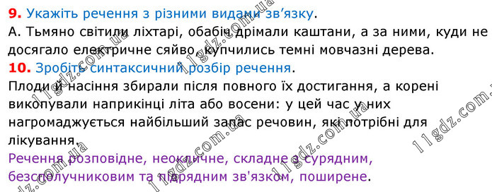 9. Укажіть речення з різними видами зв’язку. А. Тьмяно світили ліхтарі, обабіч дрімали каштани, а за ними, куди не досягало електричне сяйво, купчились темні мовчазні дерева. 10. Зробіть синтаксичний розбір речення. Плоди й насіння збирали після повного їх достигання, а корені викопували наприкінці літа або восени: у цей час у них нагромаджується найбільший запас речовин, які потрібні для лікування. Речення розповідне, неокличне, складне з сурядним, безсполучниковим та підрядним зв'язком, поширене.