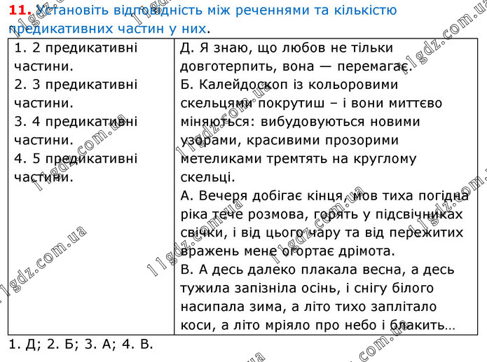 Установіть відповідність між реченнями та кількістю предикативних частин у них. 1. 2 предикативні частини. 2. 3 предикативні частини. 3. 4 предикативні частини. 4. 5 предикативні частини. Д. Я знаю, що любов не тільки довготерпить, вона — перемагає. Б. Калейдоскоп із кольоровими скельцями покрутиш – і вони миттєво міняються: вибудовуються новими узорами, красивими прозорими метеликами тремтять на круглому скельці. А. Вечеря добігає кінця, мов тиха погідна ріка тече розмова, горять у підсвічниках свічки, і від цього чару та від пережитих вражень мене огортає дрімота. В. А десь далеко плакала весна, а десь тужила запізніла осінь, і снігу білого насипала зима, а літо тихо заплітало коси, а літо мріяло про небо і блакить… 1. Д; 2. Б; 3. А; 4. В.