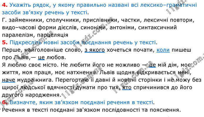 4. Укажіть рядок, у якому правильно названі всі лексико–граматичні засоби зв’язку речень у тексті. Г. займенники, сполучники, прислівники, частки, лексичні повтори, видо–часові форми дієслів, синоніми, антоніми, синтаксичний паралелізм, парцеляція 5. Підкресліть мовні засоби поєднання речень у тексті. Перше, найголовніше слово, з якого хочеться почати, коли пишеш про Львів,— це любов. Я люблю своє місто. Не любити його не можливо — це мій дім, моє життя, моя праця, моє натхнення. Львів щодня відкривається мені, наче мудра книга. Перегортаю її давні й новітні сторінки і не можу без щирої людської вдячності думати про тих, хто спричинився до його другого народження. 6. Визначте, яким зв’язком поєднані речення в тексті. Речення в тексті поєднані зв'язком послідовності та пояснення.
