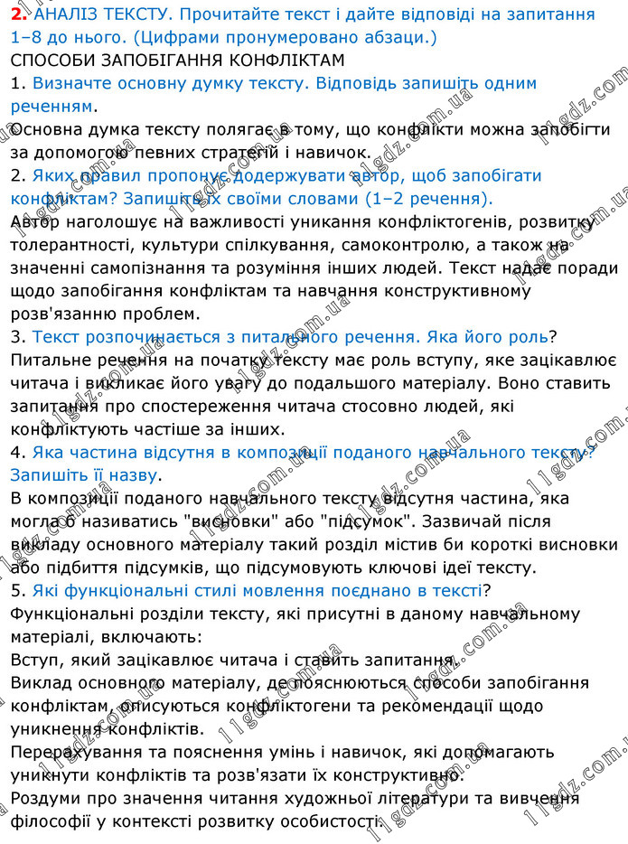 2. АНАЛІЗ ТЕКСТУ. Прочитайте текст і дайте відповіді на запитання 1–8 до нього. (Цифрами пронумеровано абзаци.) СПОСОБИ ЗАПОБІГАННЯ КОНФЛІКТАМ 1. Визначте основну думку тексту. Відповідь запишіть одним реченням. Основна думка тексту полягає в тому, що конфлікти можна запобігти за допомогою певних стратегій і навичок. 2. Яких правил пропонує додержувати автор, щоб запобігати конфліктам? Запишіть їх своїми словами (1–2 речення). Автор наголошує на важливості уникання конфліктогенів, розвитку толерантності, культури спілкування, самоконтролю, а також на значенні самопізнання та розуміння інших людей. Текст надає поради щодо запобігання конфліктам та навчання конструктивному розв'язанню проблем. 3. Текст розпочинається з питального речення. Яка його роль? Питальне речення на початку тексту має роль вступу, яке зацікавлює читача і викликає його увагу до подальшого матеріалу. Воно ставить запитання про спостереження читача стосовно людей, які конфліктують частіше за інших. 4. Яка частина відсутня в композиції поданого навчального тексту? Запишіть її назву. В композиції поданого навчального тексту відсутня частина, яка могла б називатись "висновки" або "підсумок". Зазвичай після викладу основного матеріалу такий розділ містив би короткі висновки або підбиття підсумків, що підсумовують ключові ідеї тексту. 5. Які функціональні стилі мовлення поєднано в тексті? Функціональні розділи тексту, які присутні в даному навчальному матеріалі, включають: Вступ, який зацікавлює читача і ставить запитання. Виклад основного матеріалу, де пояснюються способи запобігання конфліктам, описуються конфліктогени та рекомендації щодо уникнення конфліктів. Перерахування та пояснення умінь і навичок, які допомагають уникнути конфліктів та розв'язати їх конструктивно. Роздуми про значення читання художньої літератури та вивчення філософії у контексті розвитку особистості.